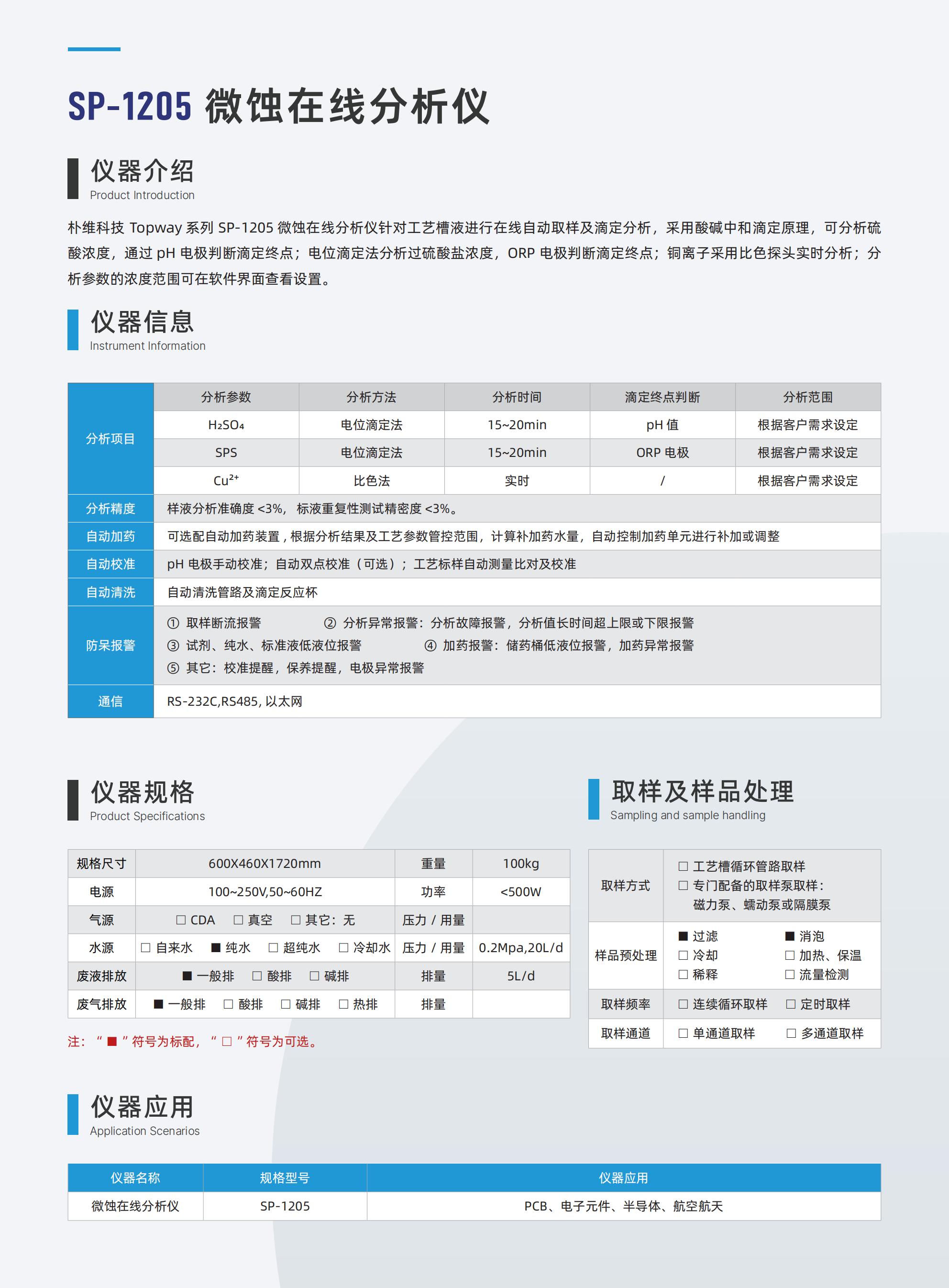 朴维科技 Topway 系列 SP-1205 微蚀在线分析仪针对工艺槽液进行在线自动取样及滴定分析,采用酸碱中和滴定原理,可分析硫酸浓度,通过 pH 电极判断滴定终点;电位滴定法分析过硫酸盐浓度,ORP 电极判断滴定终点;铜离子采用比色探头实时分析;分析参数的浓度范围可在软件界面查看设置。